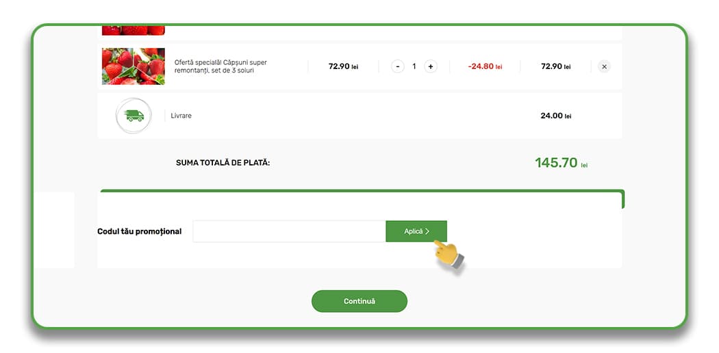 Introdu codul promoțional (dacă e cazul) în câmpul dedicat și apasă butonul verde, iar valoarea produselor comandate va fi recalculată.