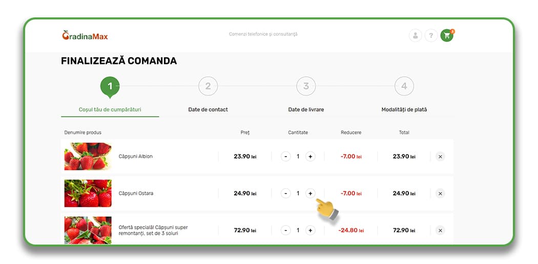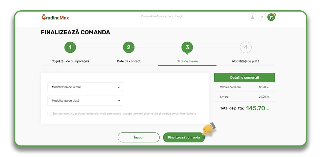 Dă click pe butonul – PASUL URMĂTOR și completează formularul de comandă cu detaliile de contact și livrare. Alege modalitatea de plată (ramburs sau card bancar) și nu uita să îți dai acceptul privind termenii, condițiile și politica de confidențialitate GrădinaMax.