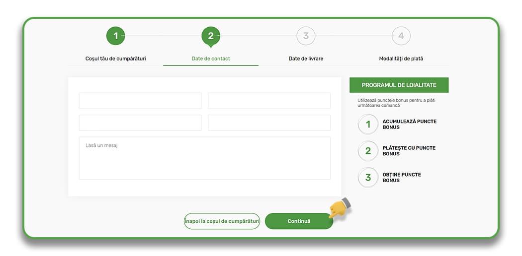 După ce ai selectat toate produsele necesare și dorești să finalizezi comanda, intră în coșul de cumpărături (dă click pe icoana ce reprezintă coșul de cumpărături și suma produselor tale).