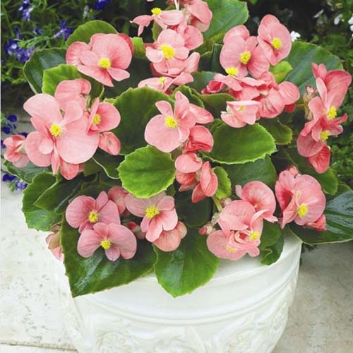 Soiul de begonii pitice, apreciat pentru efectul decorativ creat datorită inflorescențelor abundente, formate din flori de dimensiuni mici, cu petale de culoare roz. Acestea sunt întrepătrunse armonios de frunze verzi, mărunte alcătuind un contrast deosebit.