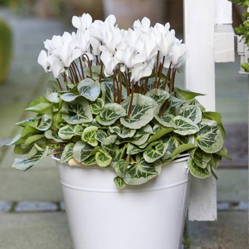 Ciclama este una dintre cele mai frumoase plante înflorite, destinate amenajărilor interioare. Acest soi produce flori mici, delicate, de culoare alb, cu frunze bicolore, ce înfățișează diferite modele în nuanțe de verde-deschis și verde-închis.