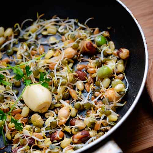 Semințele moi se spală în mod repetat, zile la rând, până când ele încolțesc și apar mugurii. Recipientul se scoate la soare sau la lumină, pentru înverzire, după care se pot consuma.