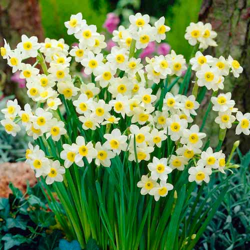 Narcisele pitice sunt cele care vestesc primăvara, aducând în peisaj culori ce trezesc natura la viață. Florile cu un diametru de 8 cm, se deschid larg la capătul tijelor verticale verzi, creând un contrast armonios cu albul petalelor și centrul galben al acestora.