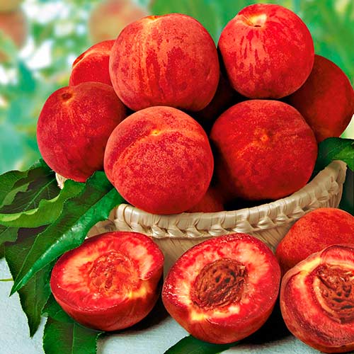 Fructele au o formă aproape perfect rotundă, cu o coajă subțire, netedă de culoare cărămiziu-închis, pulpa este portocalie cu venișoare roșii, foarte suculentă și aromată. Aceasta este împărțită în jumătate de un os oval, cu nervuri, care poate fi ușor îndepărtat atunci când fructele sunt coapte. Ele pot cântări 150-180 g.