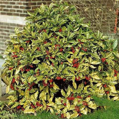 Este un arbust decorativ cu frunzișul veșnic verde, care formează tufișuri dense și bogate în frunze și flori. Frunzele de mărime mijlocie sunt ovale și au un aspect pestriț în nuanțe de verde fraged, cu suprafața lucioasă. Fructele sunt mici, sferice, de culoare roșu-intens.