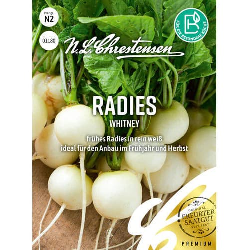 Whitney este o varietate timpurie de ridichi albe, care produce recolte bogate și de calitate superioară. Semințele fomează o mulțime de rădăcini mici, rotunde, uniforme, de culoare alb imaculat. Ridichile sunt gustoase, crocante și foarte fragede. Adăugarea lor în salatele proaspete, aduce o savoare inedită acestora, cât și altor preparate culinare.