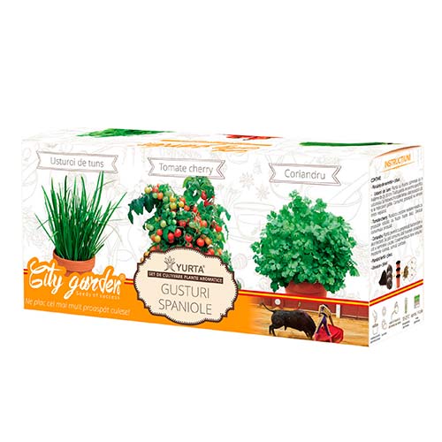 Un set deosebit, alcătuit din 3 soiuri de plante perene, apreciate pentru productivitatea bogată, cât și pentru calitatea recoltelor. Usturoiul de tuns este o plantă cu frunze fragede și cărnoase, ce au o aromă specifică. Sunt folosite proaspete sau gătite în diferite preparate culinare. Plantele de roșii cherry produc recolte bogate, cu fructe aromate și dulci. Coriandru este o plantă erbacee, foarte apreciată pentru proprietățile fungicide și bactericide. Frunzele sunt ideale pentru sosuri, ciorbe și diferite preparate din carne.