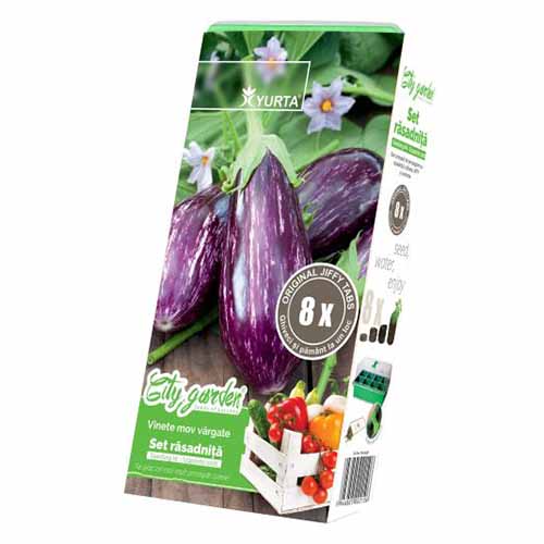 Acesta este unul dintre cele mai cerute seturi de plantare, de către grădinari. Soiul de vinete mov, vărgate este unul excelent pentru cultivarea atât în grădină, cât și în răsadnițe. Formează plante viguroase, care produc fructe piriforme, lungi, de culoare mov, cu dungi albe. Ele pot fi consumate imediat după recoltare sau pot fi depozitate pe termen lung prin congelare.