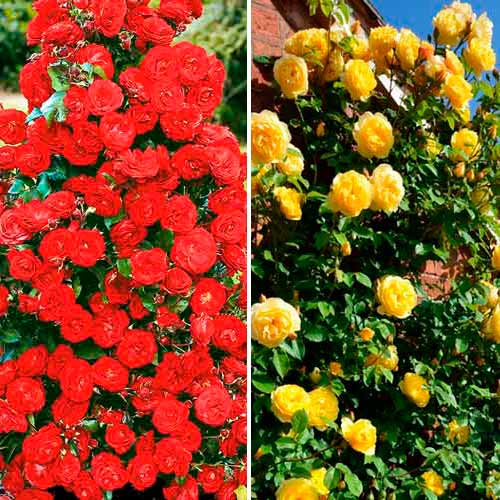 Această super ofertă cuprinde două soiuri de top din categoria trandafirilor urcători, apreciați pentru randamentul de înflorire, pentru culorile florilor, dar și pentru parfumul emanat. Ei pot fi plantați individual sau împreună, alcătuind un arbust bicolor, în nuanțe ce se armonizează perfect. Nu sunt soiuri pretențioase, ceea ce înseamnă că niciunul nu presupune condiții speciale pentru plantare și îngrijire. înfloresc bogat pentru o lungă perioadă de timp, iar florile lor rezistă mult timp după tăiere.