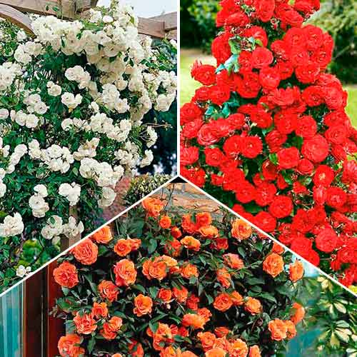 Această super ofertă cuprinde două soiuri de top din categoria trandafirilor urcători, apreciați pentru randamentul de înflorire, pentru culorile florilor, dar și pentru parfumul emanat. Cele trei varietăți superbe pot fi plantate atât împreună, formând un arbust tricolor, care va dezvolta o tufă extrem de bogată și încărcată de flori. Fiecare soi formează flori uriașe, pline, cu un colorit deosebit de atractiv, care va aduce grădinilor lumină și veselie. Trandafirii sunt ideali și pentru tăiere și păstrarea în vaze.