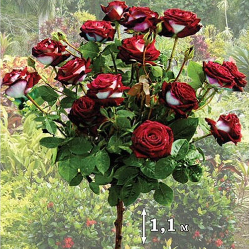 Plantă de înălțime medie, până la 120 cm. Soi puternic de trandafir, realizat prin altoire cu diferite soiuri posesoare de caracteristici decorative magnifice. Numărul de ochiuri de altoire pe trunchi însumează aproximativ 100 de bucăţi. Perioada de înflorire durează 5 luni, începând din luna iunie şi până la sfârşit de octombrie. Dimensiunea florii este mare, de până la 11 cm în diametru, pictată în 2 culori superbe, catifelate, roşu bogat şi alb strălucitor. Frunzele sunt lucioase, ca și lustruite, de culoare verde închis.