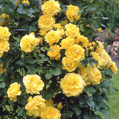 Trandafirul cățărător Lucia - popularitatea acestui soi continuă să crească. Bobocii alungiți, eleganți, se deschid lent ca trandafirii hibrizi. Bobocii au vârfurile roșii și se deschid lent ca trandafirii hibrizi. Florile sunt galbene, cu stamine aurii frumoase în centru, ușor în formă de cupă. Abia deschise, florile sunt de un galben strălucitor sau de lămâie și apoi pălesc ușor. Ele apar în ciorchini de 5-15 flori. Arbuștii nu depășesc 1,5 metri înălțime și formează un cadru rigid, ceea ce îi face potriviți pentru garduri vii pitorești. Atunci când se plantează garduri vii pe două rânduri, acest soi este potrivit pentru partea din spate, iar soiurile mai întinse se plantează în față. Datorită culorii sale deschise, acest trandafir se integrează armonios și în grupuri și straturi mixte.