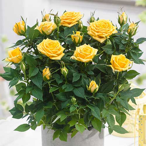 Din iunie până în octombrie, acest trandafir este acoperit cu flori mari, pline, intens parfumate. Mugurii roșiatici se deschid larg în flori de culoare galben-aprins, ce aduc viață și lumină în decorul grădinilor și al teraselor.